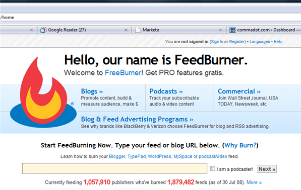 I rarely login to Feedburner even though I use it for my blog feeds. It’s a good service. I have a very specific critique though about the homepage. Every time I go to their homepage, I look for the button to login. I look all around the page, mostly in the blue area next to the flame. That area has a huge eye magnetism. (The eye is drawn to it). Additionally, the big Hello, our name is FeedBurner has a huge draw for the eye. I look and look. Finally, I realize that it is above the big bold area. The color and font of that area makes it look like a toolbar. Something meant for the chrome of the browser, not the webpage.
